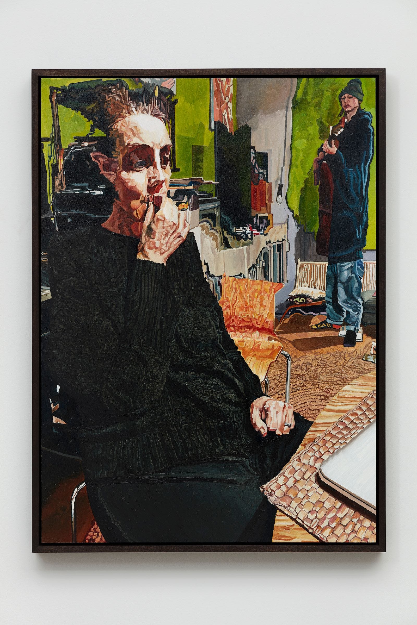 Another instance where architecture enters your work is Building, 2021, and it’s also a feat of compression. It depicts Eros House in south London, a Brutalist building designed by Rodney Gordon and Owen Luder, and Brutalism is always a charged form in the UK – it’s almost a spectral presence. It points temporally in two directions: to the past, because its emergence as a style of postwar reconstruction is inseparable from the ravages of war, and also to an unrealized future, because it embodies the failures of both social policy and modernism. But then, to add another layer, Eros House isn’t wholly of your own choosing, either. It comes almost as a ready-made subject, because you’re painting the building where the gallery Le Bourgeois is located and where the painting will later be shown. So there’s a telescoping effect here – from general to highly specific – that I think becomes synecdochal to the larger project. You paint people you know, but these subjects are embedded in a set of social conditions that might lead us outward, toward other cultural associations and reverberations. In an ambient kind of way, for example, I’m often put in mind of Mike Leigh films like High Hopes or Meantime, which might suggest a certain tonal resonance. So I’m interested in how this decision to assert this sense of sociality – or, perhaps, to reassert it, because you also certainly painted people you know in your earlier work – plays out? It doesn’t feel aligned with other modes of social painting like “hypersentimental portraiture” or “network painting,” although perhaps it may operate similarly – the closer we are to you or your particular social context, the more we recognize in your work.