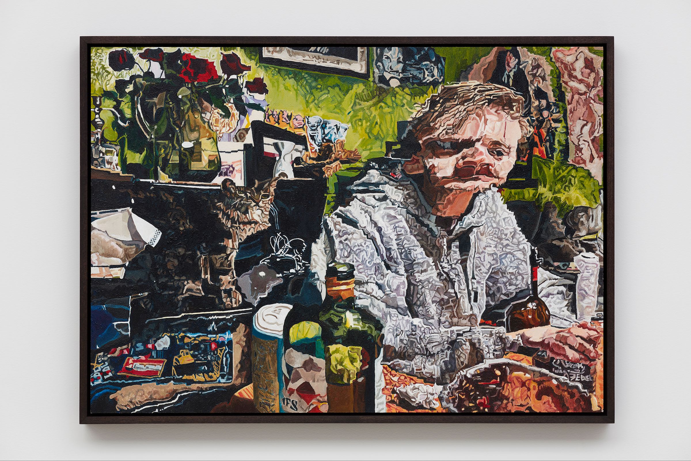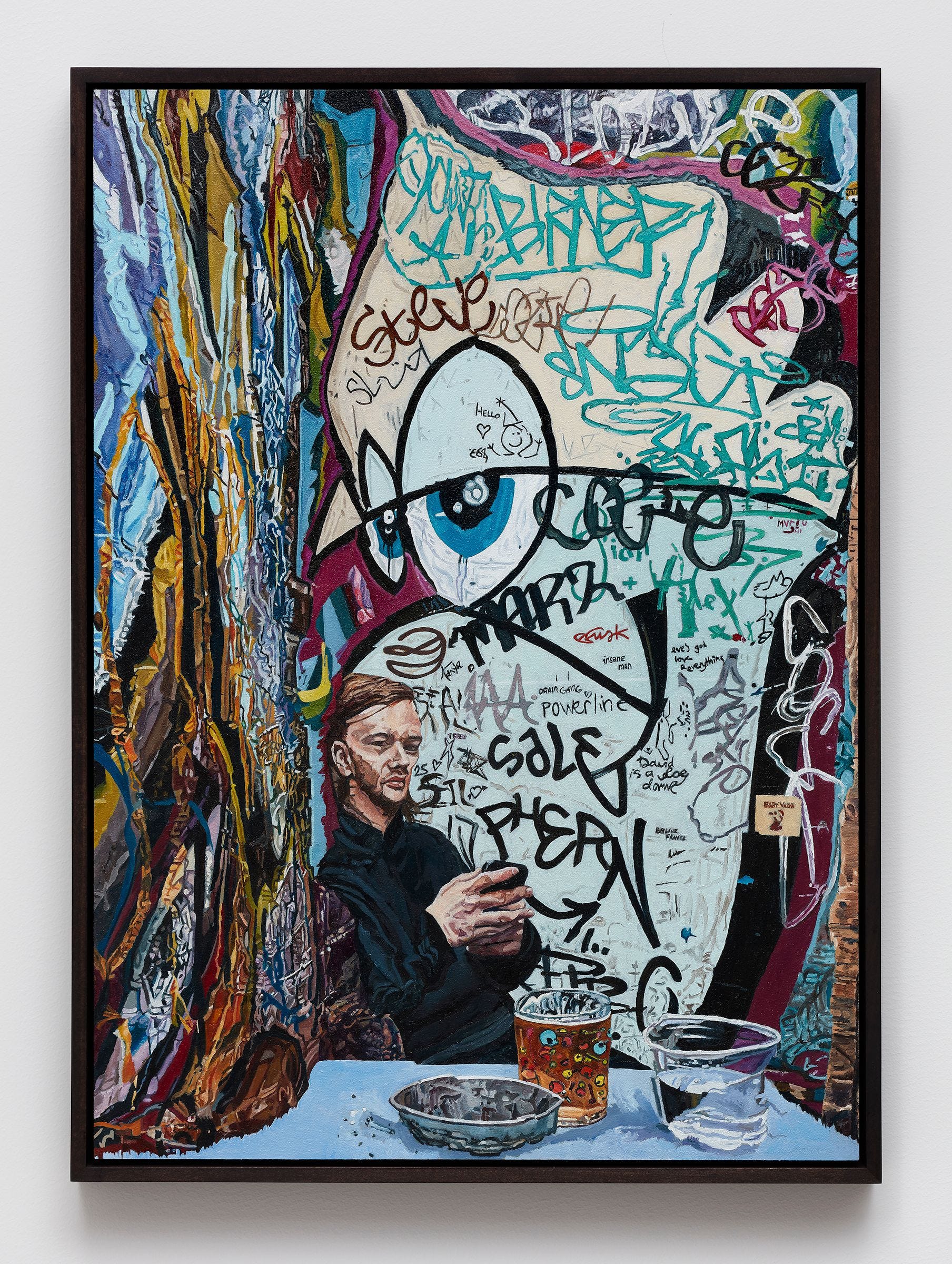 At the same time, the effect of the paintings is not entirely one of pictorial construction, but also of mediation. I was happy to see this word in Daniel Neofetou’s exhibition text for Leanings, because it confirmed my initial impression. It’s almost as if there’s something situated between us, as viewers, and the interior space of the painting, some source of interference occurring at the picture plane. And I think certain works of yours would suggest this reading, as well. The Glass, 2021, for instance, features a subject looking at his hand through a glass of water, and that struck me as a sort of interpretive key. It suggests that we, too, are looking through the glass, at least allegorically. I’d like to perhaps place this idea into contention with Neofetou’s statement from the Leanings text that, “The conditions of possibility for painting are always a series of mediations. These mediations are a successive series of nows.” We’ll get to now-ness later, so maybe we could stick with mediation for the moment. I’m curious as to why you would choose, particularly over the past five or so years, to emphasize the fact that painting is always a mediated encounter. Why insist, on the level of form, that what we’re seeing is, fundamentally, mediated by the artist?