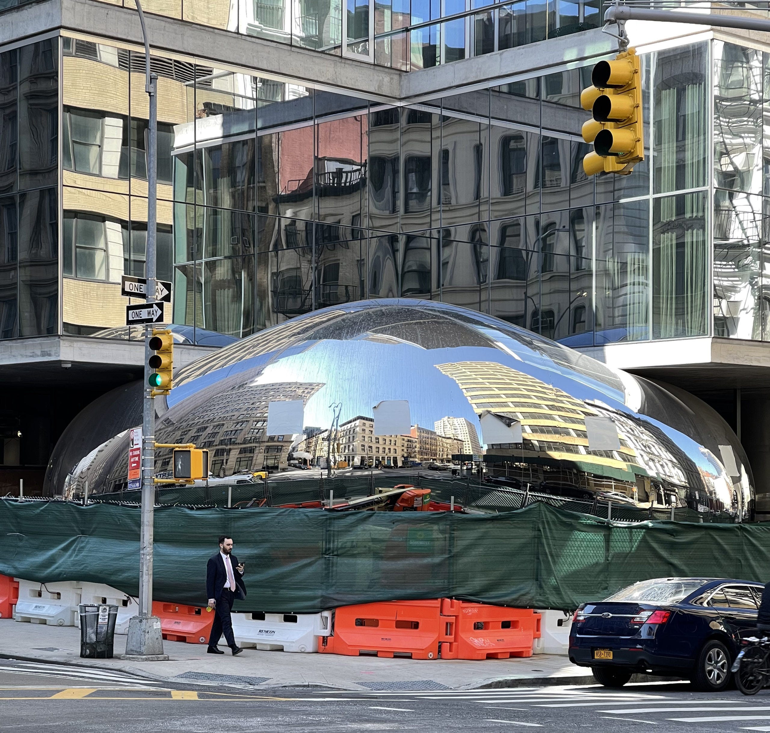 Although Cloud Gate was unveiled belatedly, two years after the opening of Millennium Park, it still seemed to have materialized spontaneously, like a drop of mercury spilled by God. In contrast, the New York sculpture emerged slowly, fitfully, with the entire city witness to its awkward, intermittent production. Construction began in 2019, two years after the completion of 56 Leonard, the skyscraper that occasioned its commission. It was then stalled by the pandemic and the consequent visa issues incurred by Kapoor’s UK-based team, who were unable to enter the United States. After construction resumed, in the summer of 2022, another mishap came when one of the sculpture’s steel plates ruptured in the heat of the sun, resulting in another delay. It was during this long period that people began taking photos of the unfinished work – “one part reflective mirror, one part boarded-up abyss,” per Sophie Haigney, in her coverage for Curbed – and it was christened the Half-Bean. This moniker has endured, perhaps due to the work’s diminutive relationship to the original. (In actuality, the New York sculpture is scaled to around 70 percent of Cloud Gate’s dimensions in width, and 60 percent in height, so it is now closer to call it the Two-Thirds Bean.) In the end, roughly six years passed between the completion of 56 Leonard and that of the beleaguered New York sculpture. When the sculpture revealed its final form, it at last appeared to provide some sort of structural corrective to the high-rise towering above it, wedged humorously, as it was, under 56 Leonard, like a fistful of napkins beneath a wobbling table.